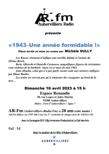 L’association AR.fm présente la pièce de théâtre “1943-Une année formidable !” écrite par Michèle SULLY, le dimanche 16 Avril à 15 h, à l’Espace Renaudie, avec la Compagnie B.I.P (Big Immersive Production) et La Clef des Arts.