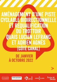 De janvier à octobre 2022, une nouvelle piste cyclable va être réalisée à Aubervilliers ainsi qu’une requalification du trottoir Quais Lucien Lefranc et Adrien Agnès (côté canal).
