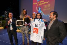 Michel Buton, entraîneur emblématique du club d’athlétisme d’Aubervilliers, et Kalidiatou Niakaté championne du monde de handball, se sont vus décerner la médaille de la Ville par la maire, Mériem Derkaoui, et son adjoint aux sports, Salah Chibah.