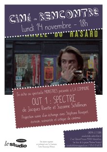 Film-fleuve de Jacques Rivette projetée au Studio le lundi 14 novembre, 18 h, suivi d’un échange avec Stéphane Bouquet, écrivain, scénariste et critique de cinéma .