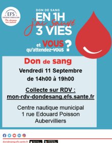 La Ville d’Aubervilliers et l’EFS organisent un don de sang, vendredi 11 septembre, de 14 h à 19 h, au centre nautique municipal Marlène Peratou.
