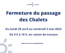 Le passage des Chalets sera fermé, du 29 avril au 3 mai 2024, de 9 h à 16 h, en raison de travaux.