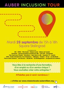 Vous êtes à la recherche d’un emploi ou d’une formation ? Besoin de conseils ou d’aide pour créer votre entreprise ou mettre en place votre projet professionnel ? Vous souhaitez avoir des informations sur les dispositifs d’accompagnement (ex : la Garantie jeunes) et d’aide à l’emploi ? L’Auber Inclusion Tour vient à votre rencontre, mardi 28 septembre, de 15 h à 18 h, au square Stalingrad.