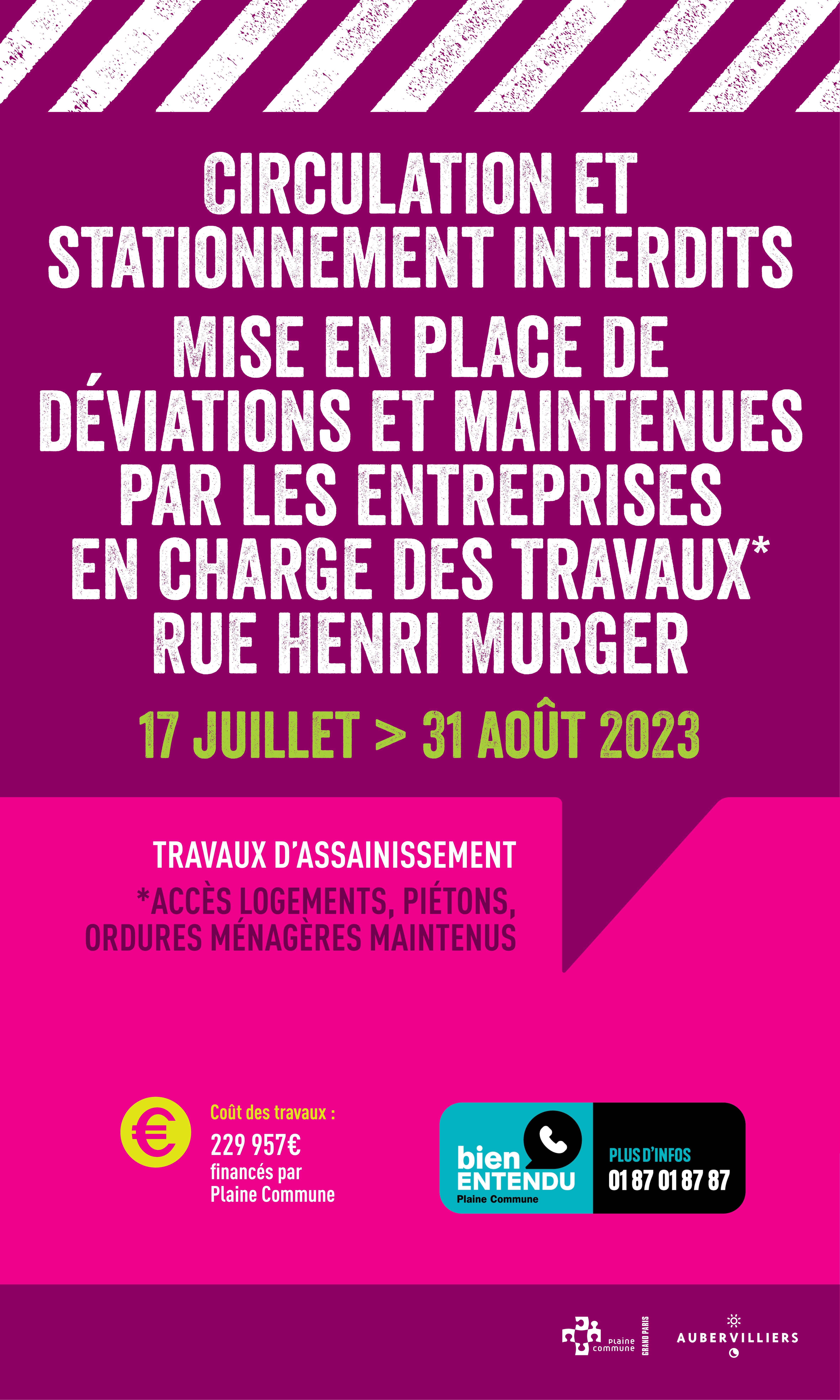 La Ville d’Aubervilliers et Plaine Commune entreprennent, du 17 juillet au 31 août, des travaux d’assainissement rue Bengali. Pour vous faciliter la ville, la rue Bengali se transforme et se modernise. Remplacement de la canalisation vétuste et des branchements aux réseaux d’assainissement. Remise en état de la chaussée et des trottoirs.Durant les travaux :