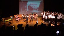 Les élèves de CM1 B, CM1 C et CM2 A de l’école Wangari Maathai d’Aubervilliers jouent et chantent dans la comédie musicale L’aviateur américain, adaptée des œuvres de Julien Joubert par des professeurs de l’école.