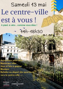 La Ville d’Aubervilliers propose, samedi 13 mai, de nombreuses animations visant à promouvoir les mobilités douces, pour une occupation de l’espace public, en préfiguration de la piétonisation de la rue du Moutier et d’une partie de l’avenue de la République ainsi que du projet global d’apaisement du centre-ville.