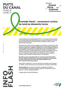 Par ailleurs, et pour permettre la mise en service de la gare Saint-Denis Pleyel en 2024, le tunnelier Sarah poursuivra désormais son creusement du lundi au dimanche inclus, avec une activité possible la nuit. Et ce, à partir du 16 janvier prochain.