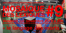 La Mosaïque des Lexiques est une revue vivante qui a lieu tous les premiers vendredis de chaque mois aux Laboratoires d’Aubervilliers. Elle propose de croiser les jargons, comparer les lexiques, les langues, multiplier les adresses. En bref, on y cause, traduit, chante, danse, fête chaque fois le mois nouveau.