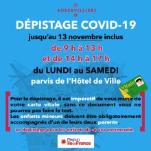 Depuis le 21 octobre et jusqu’au mardi 17 novembre 2020 inclus, une campagne de dépistage permet aux Albertivillariens de se faire dépister gratuitement du lundi au samedi, de 9 h à 13 h, et de 14 h à 17 h, place de l’Hôtel de Ville.