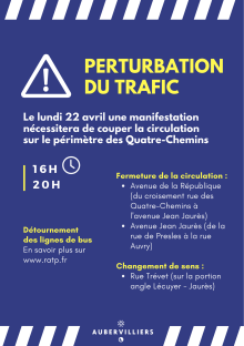 Lundi 22 avril de 16 h à 20 h, une manifestation nécessitera de couper la circulation autour du périmètre des Quatre-Chemins.