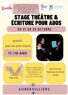 Du 21 au 25 octobre 2024 la compagnie Étincelles organise un stage pour ados entre 11 et 16 ans gratuit dans le quartier Émile Dubois / Maladrerie, au 153 rue Danielle Casanova.