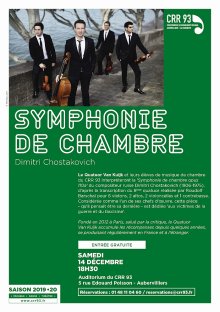 Le Quatuor Van Kuijk et leurs élèves de musique de chambre du CRR 93 interpréteront l’oeuvre Symphonie de chambre op 110 A du compositeur russe Dimitri Chostakovich (1906-1975), arrangée par Roudolf Barchaï pour 3 violons 1 et 3 violons 2, 2 altos, 2 violoncelles et 1 contrebasse.