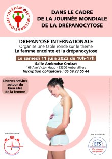 Dans le cadre de la journée mondiale de la drépanocytose, l’association Drepan’ose Internationale organise une table ronde sur le thème la femme enceinte et la drépanocytose, samedi 11 juin de 10 h à 17 h, salle Ambroise Croizat.