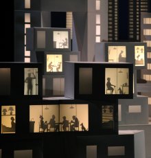 Cette histoire est mise en scène dans une maquette spectaculaire animée par des jeux d’ombres et de lumières, terrain de jeu pour quatre marionnettistes et deux