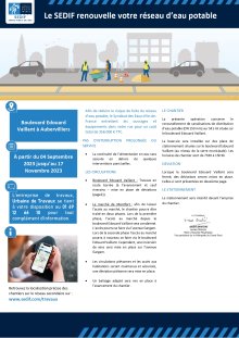 Du 04 septembre 2023 au 17 novembre 2023, des travaux seront réalisés afin de réduire le risque de fuite du réseau d’eau potable sur le boulevard Édouard Vaillant.