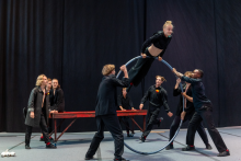 Sur la musique de Darius Milhaud « Le bœuf sur le toit », ces neuf circassiens s’unissent pour nous faire découvrir leurs différents univers. Parmi eux, celui du jonglage, de l’acrobatie, de la contorsion, de la roue Cyr, du rola bola…