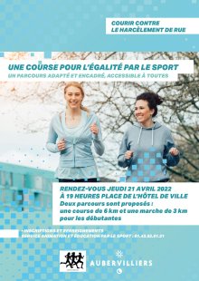 La Direction des sports d’Aubervilliers propose, jeudi 21 avril 2022, une nouvelle course féminine à travers la ville contre le harcèlement de rue que certaines coureuses peuvent subir pendant leur jogging. Deux parcours sont proposés : un de 6 km et un de 3 km pour les débutantes.