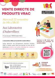 Venez découvrir, mercredi 22 novembre, de 14 h à 18 h 30, aux Laboratoires d’Aubervilliers, les groupements d’achats citoyens VRAC à travers une vente de quartier où plus de 20 références produits de qualité, labellisés bio, vendus à